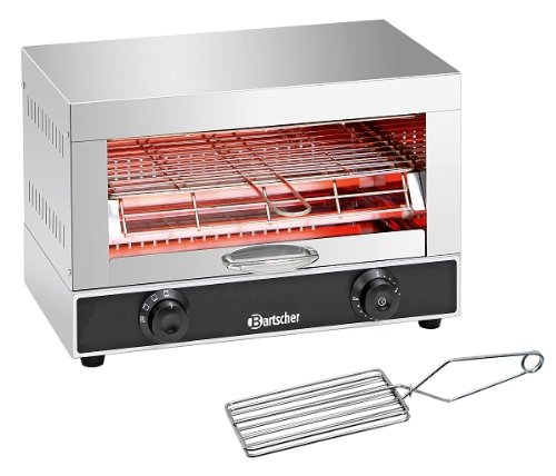 Appareil à toaster/gratiner simple, il grille aussi tous les pains. Boîtier en acier inoxydable, résistances en quartz, minuterie de 15 minutes. Grille et pince à toasts incluses.